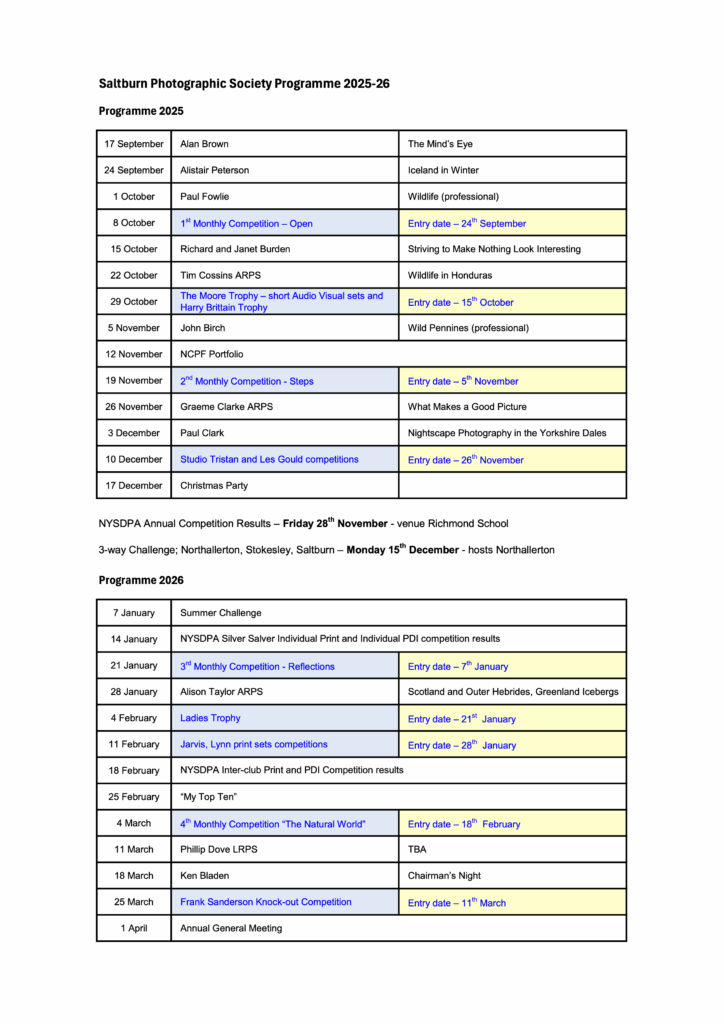 Our meetings run from September to March on Wednesday evenings at the Methodist Church Hall, Milton Street, Saltburn-by-the-Sea. Doors open at 7:00pm for chat and hot drinks, with the presentation starting at 7:30pm.