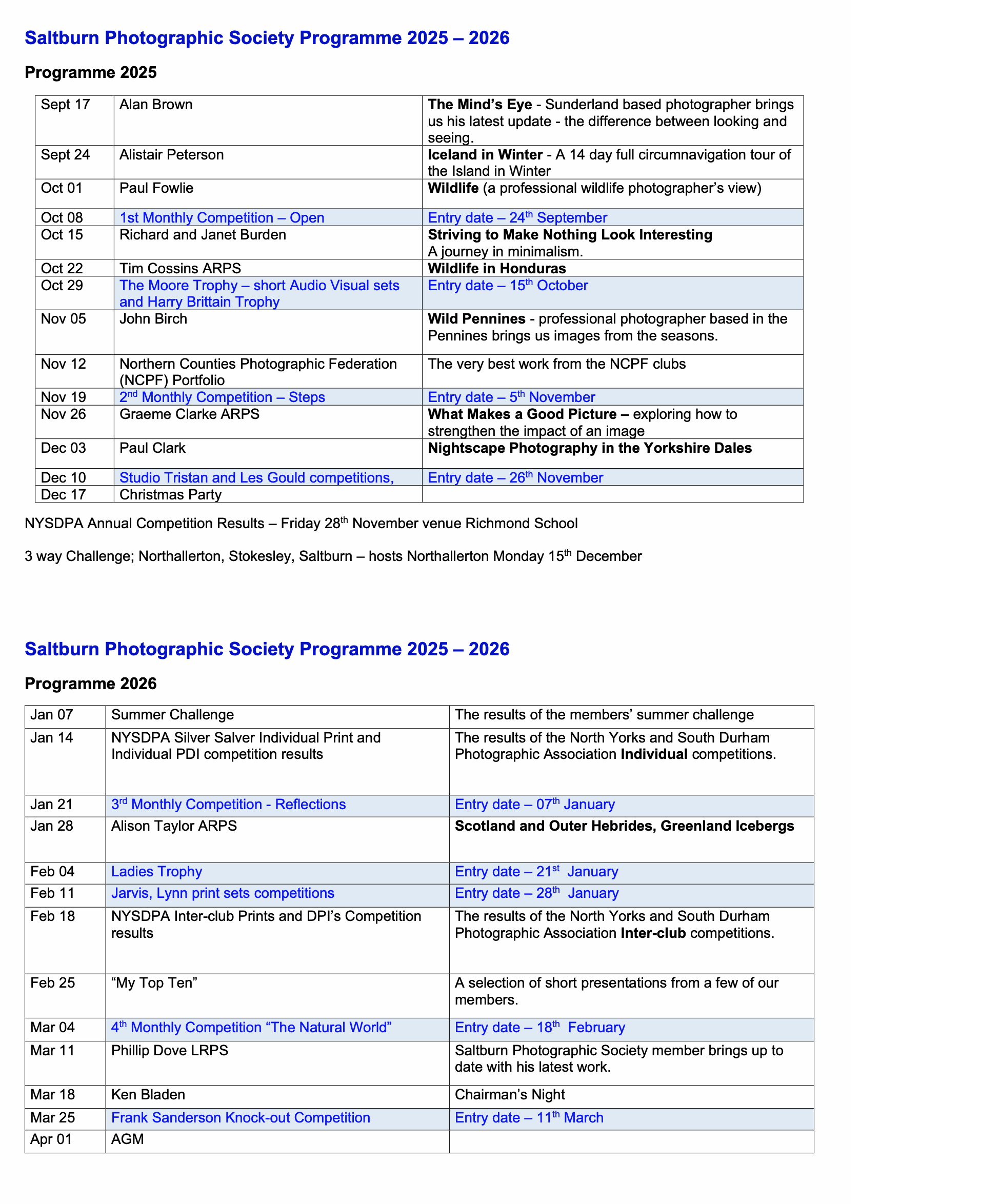 Our club is focused on providing a high-quality level of service to its members through regular meetings and photographic trips and events. The club programme has many varied activities that aim to meet all of our members' needs and interests.
